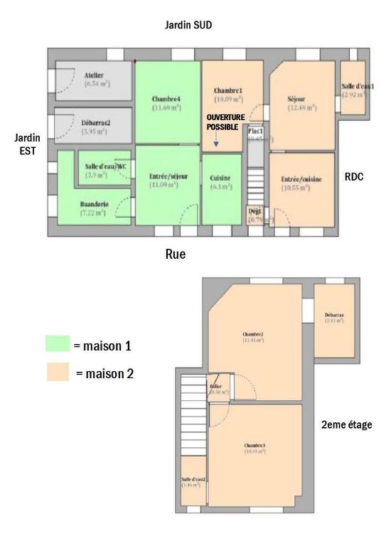 Option de Réunion des Maisons : Possibilité de relier les deux maisons par la chambre et la cuisine pour créer un ensemble de 105m² (voir plan).